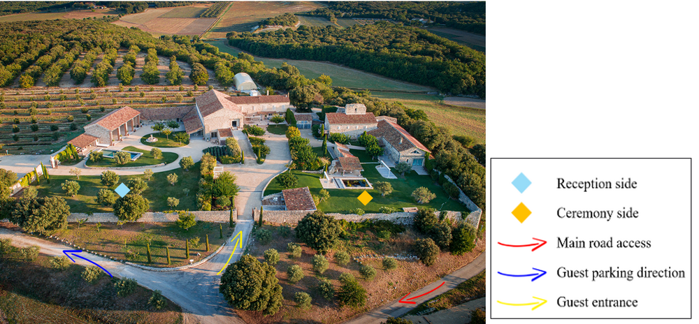 If you are arriving by car, please use the guest parking area and enter through the guest entrance. The ceremony will take place on the ceremony side of the Domaine.
